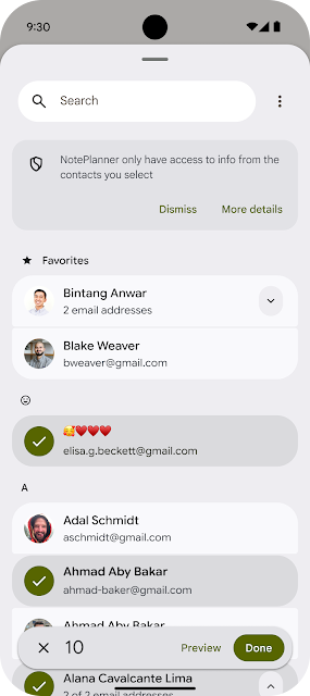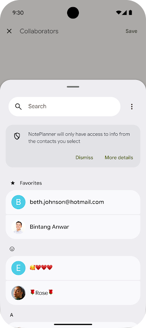 Privacy and user control remain at the heart of the Android experience. Just as the photo picker made media sharing secure and easy to implement, we are now bringing that same level of privacy, simplicity, and great user experience to contact selection.