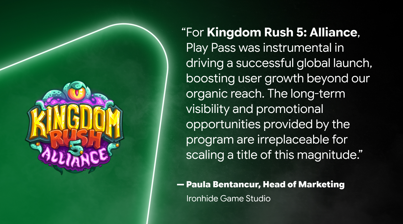 Play Pass is another way to diversify revenue and grow your player audience. It has been a strong launchpad for indie hits such as Isle of Arrows, Slay the Spire, and Dead Cells. With Play Pass, you can reach highly dedicated players seeking a more curated gaming experience, free of ads and in-app purchases. To help you deepen engagement, paid titles on Play Pass can now opt in to Google Play Games on PC — making it easy for players to find and play your games on a larger screen. Later this year, you can nominate your game through a streamlined opt-in process directly in Play Console.