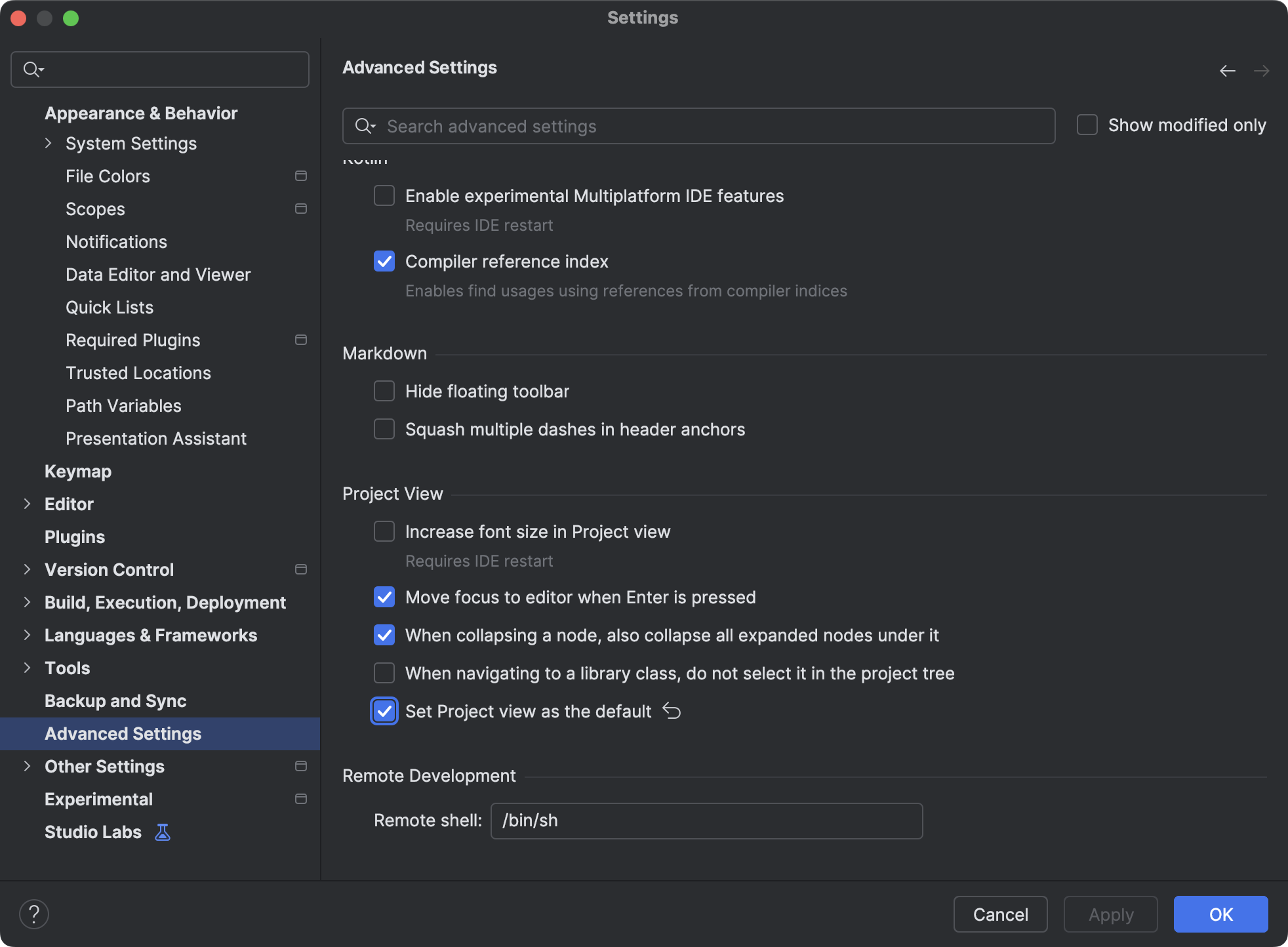 Tired of always having to switch to the Project view every time you open a new project? There is a new setting to have new projects open in Project view by default. To enable the setting go to File (Android Studio on macOS) > Settings > Advanced Settings > Project View and select Set Project view as the default.