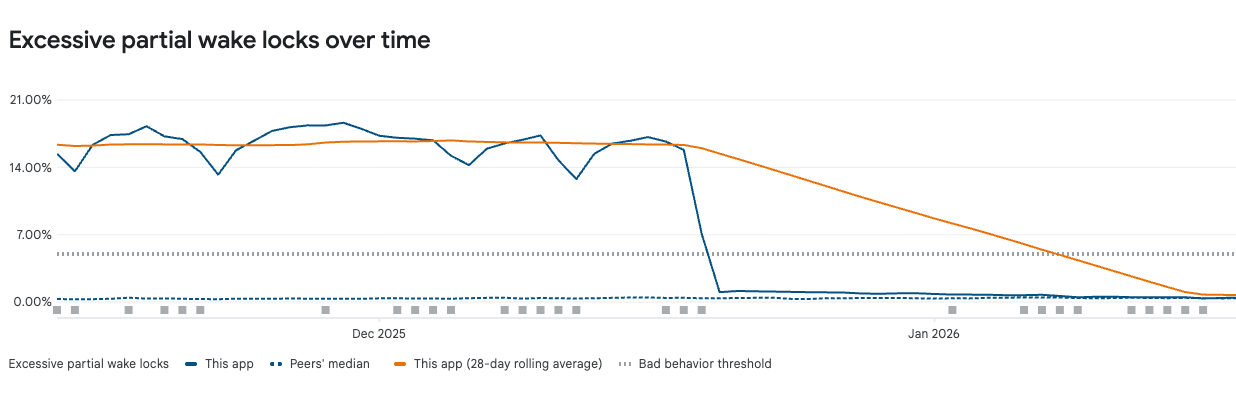 Earlier this year, Google Play released a new metric in Android vitals: Excessive partial wake locks. This metric measures the percentage of user sessions where cumulative, non-exempt wake lock usage exceeds 2 hours in a 24-hour period. The aim of this metric is to help you identify and address possible sources of battery drain, which is crucial for delivering a great user experience.