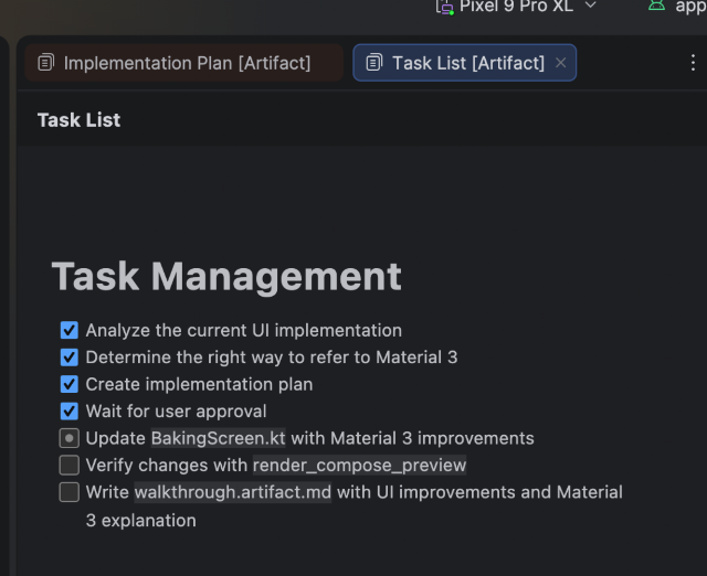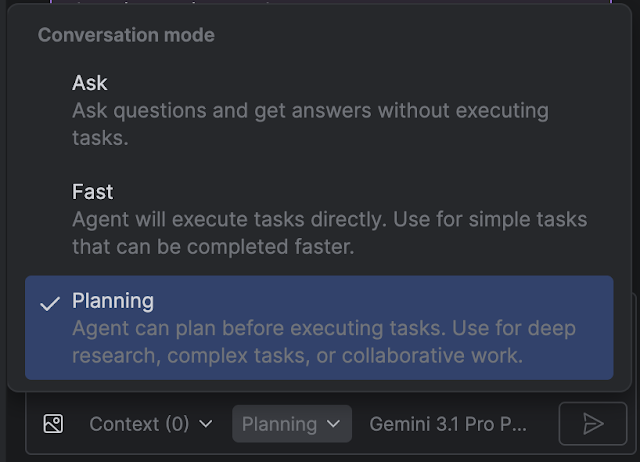 In this mode, the Agent comes up with a detailed project plan before executing tasks. Instead of a single pass where the model directly predicts the next token of code, Planning Mode facilitates a multi-stage reasoning process — giving the agent additional space to evaluate its own proposed logic for potential issues before presenting it to you. This is especially useful for complex and long-running tasks which demand a high degree of architectural precision.