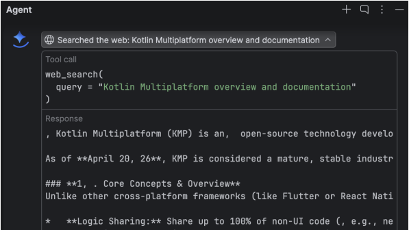 While Android Studio’s agent already leverages the Android Knowledge Base for official documentation, modern Android development relies on a vast ecosystem of external libraries. Agent Web Search expands Gemini’s reach, allowing it to query Google directly to fetch current reference material from across the web. From checking the latest setup guides for Coil to finding advanced configuration tips for Koin or Moshi, the agent can now pull in the most up-to-date information in real time.