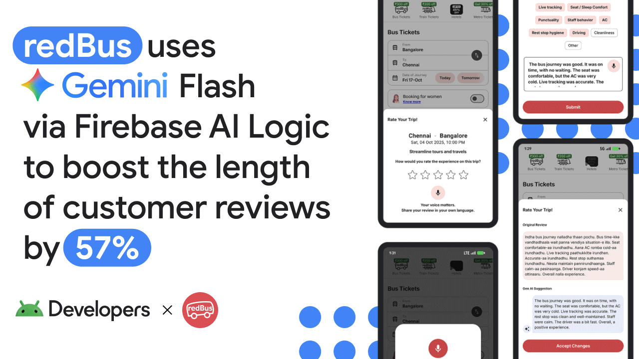 To improve the quality and volume of user feedback, developers at redBus used Gemini Flash, a Google AI model providing low latency, to instantly transcribe and translate user voice recordings. To connect this powerful AI to their app without dealing with complex backend work, they used Firebase AI Logic. This new feature removed language barriers and simplified the review process, leading to a significant increase in user engagement and feedback quality.