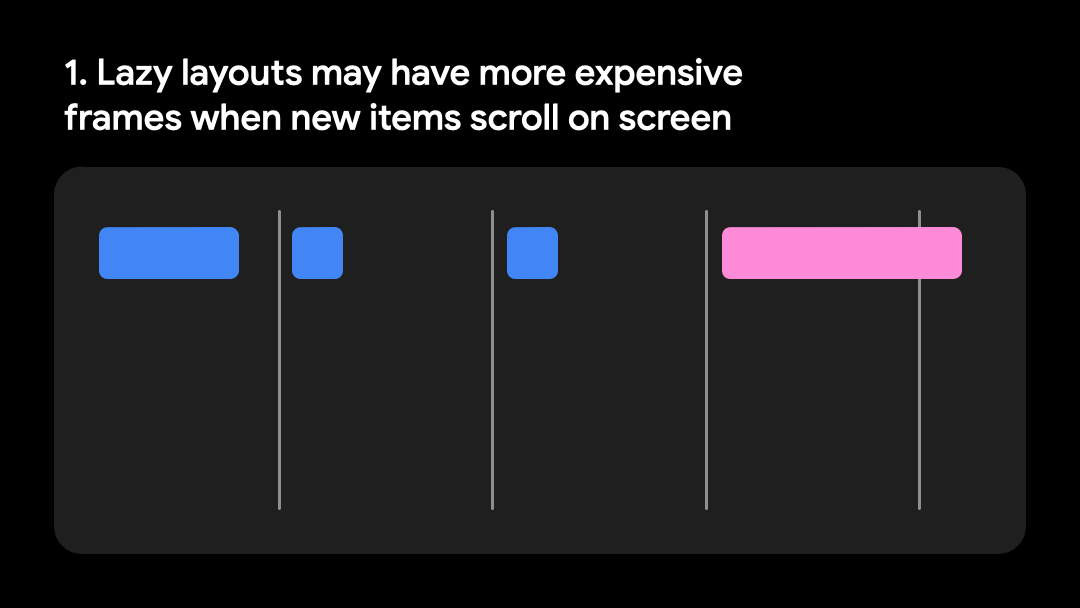 Previously, once a composition started, it had to run to completion. If a composition was complex, this could block the main thread for longer than a single frame, causing the UI to freeze. With pausable composition, the runtime can now “pause” its work if it’s running out of time and resume the work in the next frame. This is particularly effective when used with lazy layout prefetch to prepare frames ahead of time. The Lazy layout CacheWindow APIs introduced in Compose 1.9 are a great way to prefetch more content and benefit from pausable composition to produce much smoother UI performance.